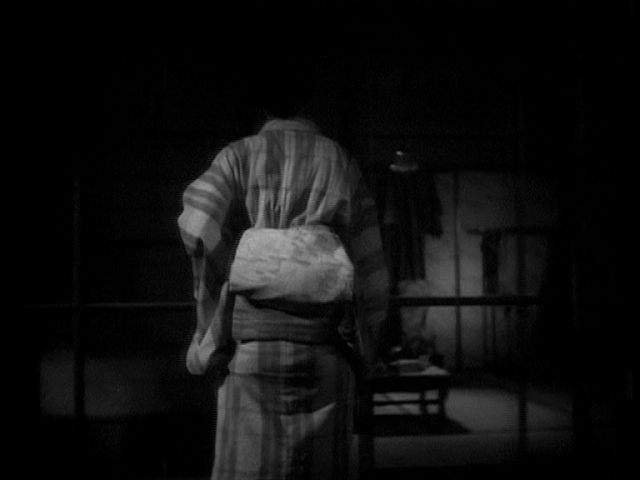 Aún así, Sumako no Koi, abunda en escenas plenamente Mizoguchianas, como puede comprobarse en las capturas que abren esta entrada. Tenemos aquí expresada de manera ejemplar una de las constantes de estilo de mizoguchi: la contradicción entre una cámara siempre pendiente de sus personajes pero al mismo tiempo respetuosa de su intimidad, o lo que es lo mismo, el difícil equilibrio entre una cámara siempre móvil - el supuesto rasgo rasgo definitorio de Mizoguchi - y una cámara estática - característico de su contrario Ozu, al menos para los admiradores de este director. En esta escena, asistimos a una cámara que sigue a Tanaka/Sumako en todo su recorrido por las calles - pero permitiendo que otros objetos la tapen cuando cruzan entre nosotros y ella - un espacio público que se opone al espacio privado de su apartamento, en cuyo umbral la cámara se detiene sin atreverse a entrar, deviniendo estática y adoptando el punto de vista de un observador casual - casi podría decirse como un mirón - que contempla algo que no le estaría permitido, subrayando así el momento de relajación de la actriz, desprovista ya de todos sus ropajes y entregada reposar del descanso del día.