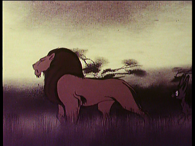 El segundo es como los animadores de los países del este se las arreglaban por conectar con la vanguardia a la menor de las ocasiones. En Lev i Byk, aunque la animación toma formas más tradicionales, el fondo sobre el que se mueven pertenece a otro ámbito estético completamente distinto. Tanto, que la discordancia entre ambos casi se las arregla para romper la unidad del corto, que sólo se restaura debido al uso de una paleta muy apagada, reducida a ocres, pardos y grises. La razón de este conflicto entre fondos y personajes es que aquellos son consciente y voluntariamente abocetados, reducidos a manchas informes, casi abstractas, propias de los informalismos de posguerra, que, no obstante, consiguen crear la ilusión de la sabana africana sobre la que se mueven los animales protagonistas.